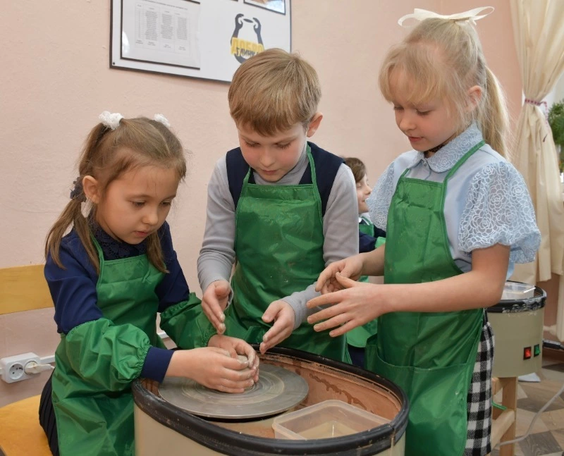 Отличница Кира Лытнева не только регулярно посещает все уроки, но и приходит на дополнительные, участвует в конкурсной деятельности. В этот раз она сделала фигурку животного, а после сушки будет раскрашивать поделку. Не отстаёт от неё и одноклассница Маша Мирная. Обе девочки самостоятельно пробуют работать на гончарном круге. И пусть пока получается не всё идеально, они стараются.