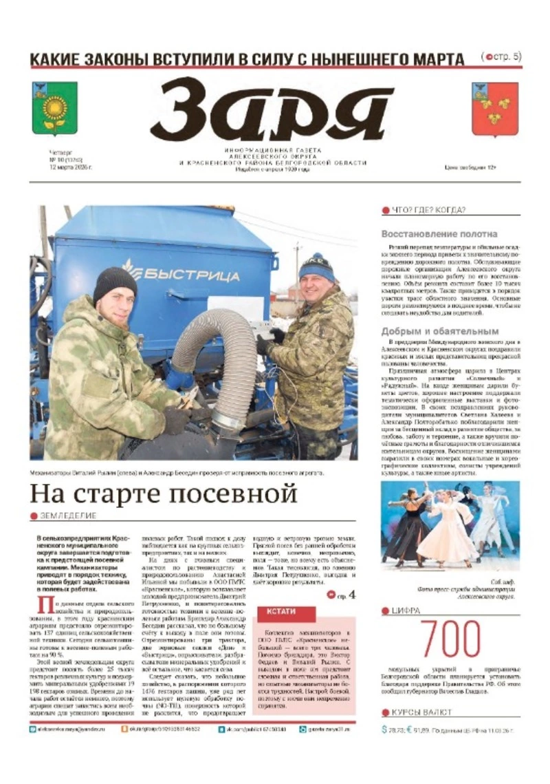 Газета «Заря» №10 от 12 марта 2026 года