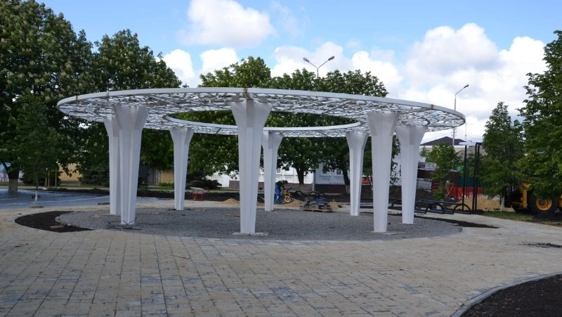 В настоящее время рабочие устраивают пешеходные дорожки, устанавливают объекты уличного освещения и малые архитектурные формы, производят озеленение территории.