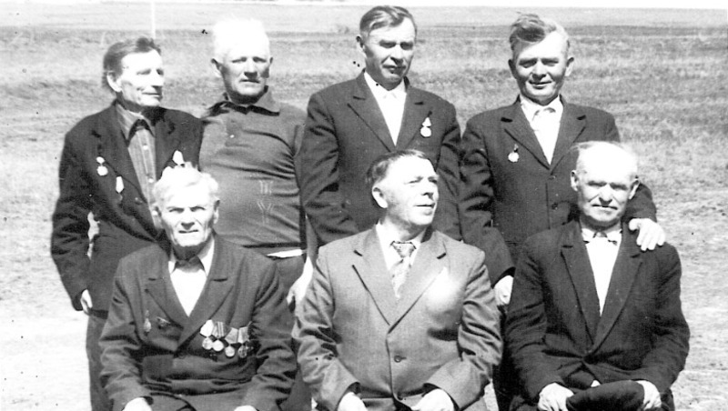 В нижнем ряду первым слева сидит Пантелей Захарович Долгопол. Воевал на самых трудных участках фронта, был дважды ранен. За проявленное мужество в боях под Прохоровкой награждён орденом Красной Звезды и орденом Отечественной войны I степени. В центре — Михаил Семёнович Ласковец. За боевые заслуги награждён орденом Отечественной войны I степени. Благодаря своим личностным качествам, среди которых честность и справедливость, был назначен председателем ревизионной комиссии, кем и работал до пенсии. Рядом с ним — Иван Сергеевич Букша. За боевые заслуги имеет орден Отечественной войны II степени. Был очень трудолюбивым, добродушным человеком. Всю жизнь работал трактористом.