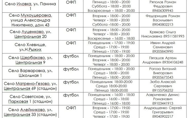 С расписанием работы тренеров и местами проведения занятий можно ознакомиться ниже: